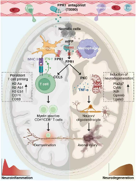 针对这一长期困扰医学界的难题,施福东课题组经过多年攻关,阐明受损细胞释放的线粒体甲酰肽可通过激活FPR1,驱动脑内炎症区域化进展并诱发神经退行的双通路病理机制。