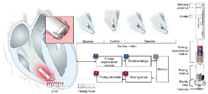 这款起搏器的核心创新是集成了高效能量再生模块:它能通过电磁感应技术,从心脏自身的跳动中捕获动能,并将其转化为电能。测试显示,其输出功率已突破起搏器终身运行的临界能量阈值,可稳定驱动起搏电路,实现对心脏节律的精准调控。同时,器件采用高度微型化设计,兼具优异的生物相容性与血液相容性,支持经导管微创植入,大幅降低手术创伤。